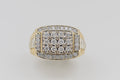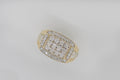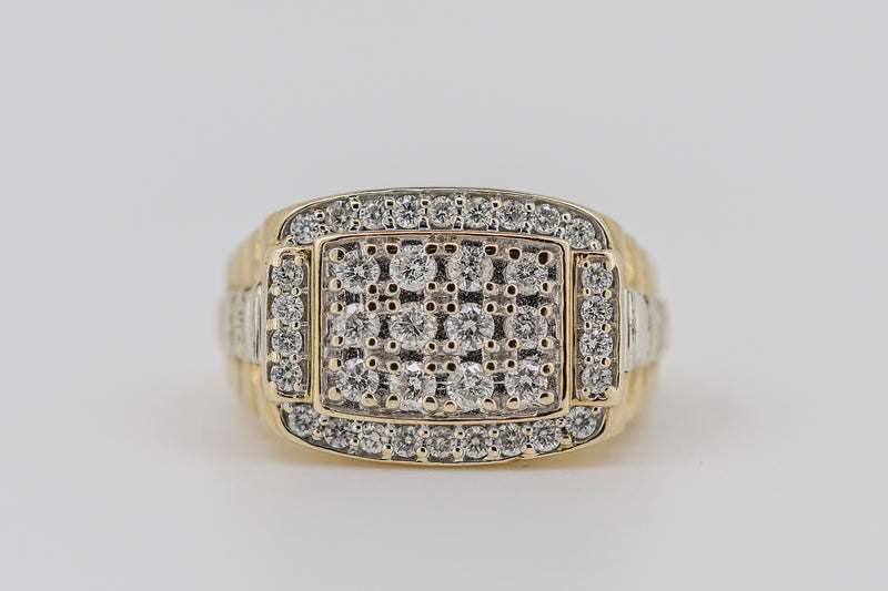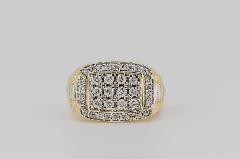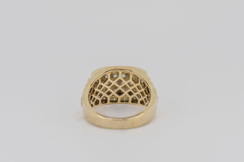 This great ring has twelve round brilliant-cut diamonds bead set in the raised centre plate. Then there are are whopping twenty six round brilliant-ct diamonds that are bead set around the centre plate. It has a tappered, square profile with the shoulders becoming raised to the terraced pattern with white gold centre section.