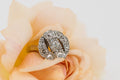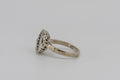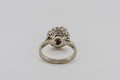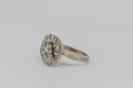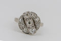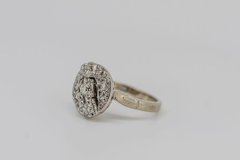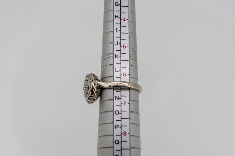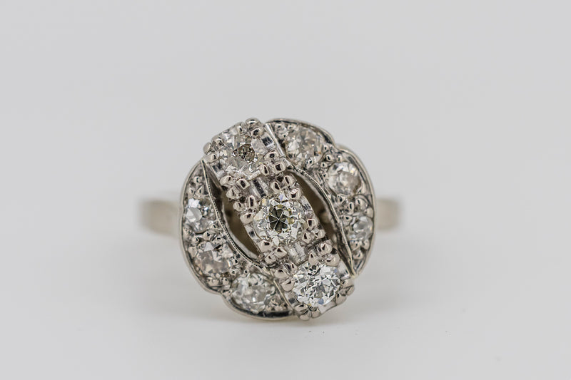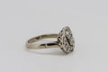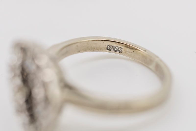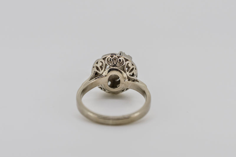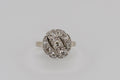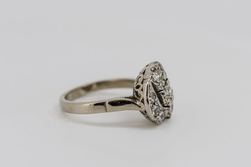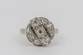 stamped 18ct and has a hand made setting. Nine round old-cut diamonds, in sets of three, are bead-set into the round and pierced plate with the centre portion raised. It has a pierced scroll design gallery.