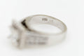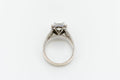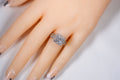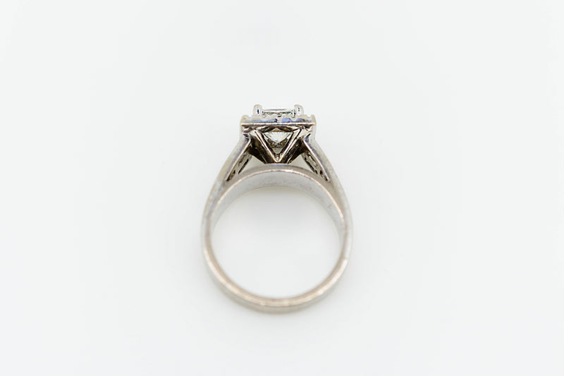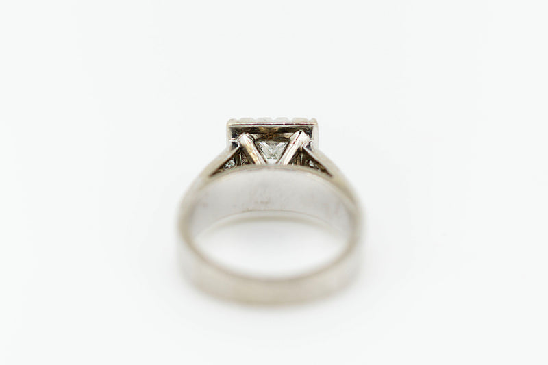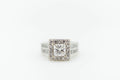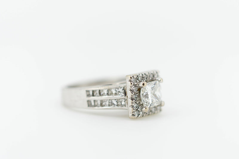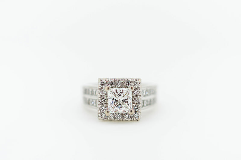 18ct White Gold Square Set Halo Diamond Ring with Channel Set Double Row of Accent Diamonds on Shoulder