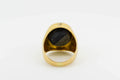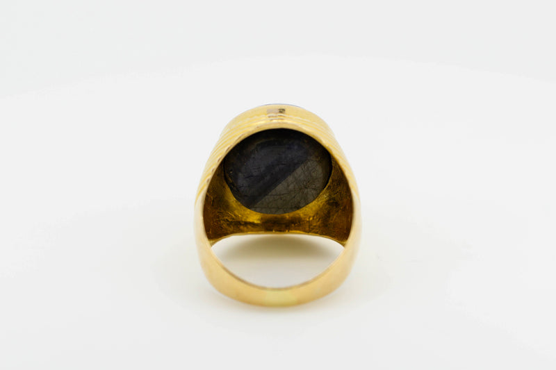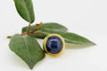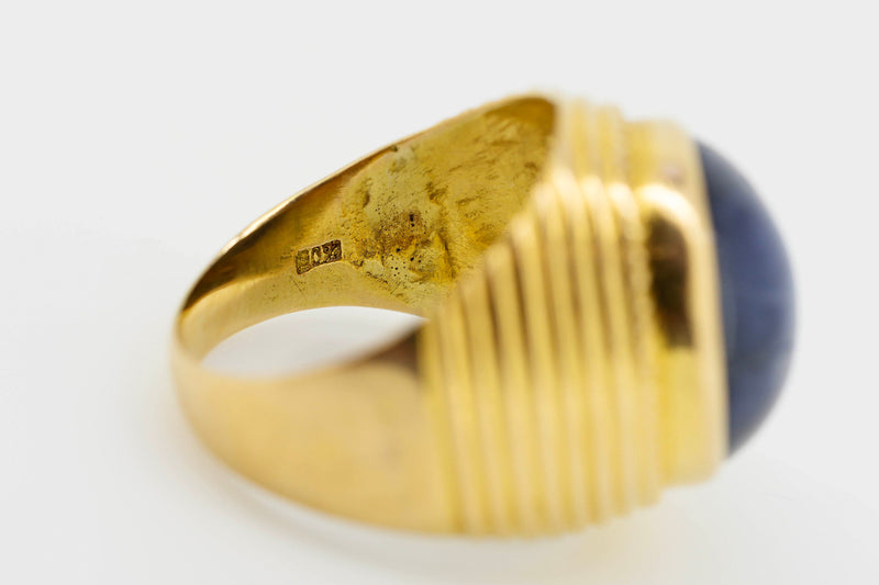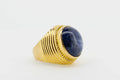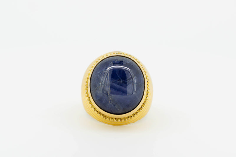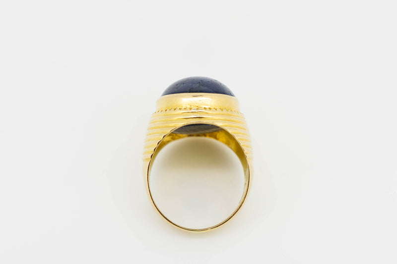 9ct Yellow Gold Blue Polished Stone Ring with thick band detailed by filigree