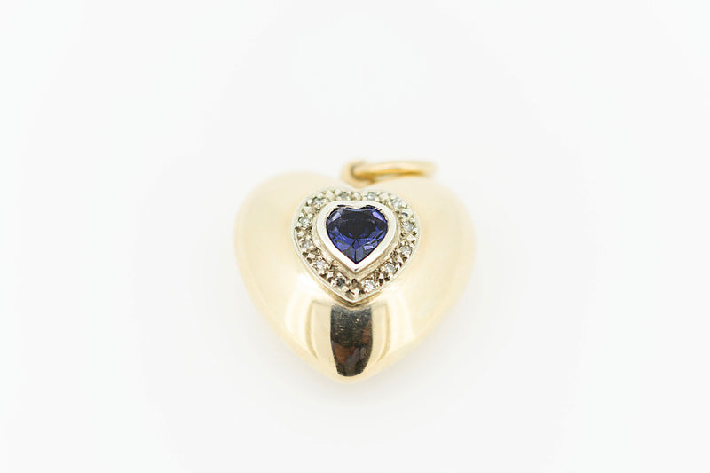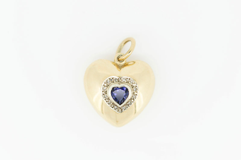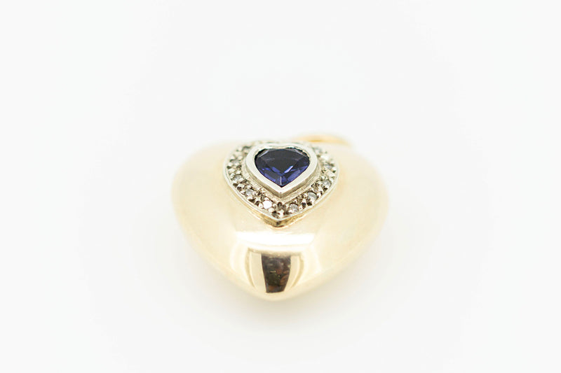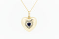 9ct Yellow Gold Hollow Heart Pendant with Heart Shaped Blue Sapphire with Accent Diamonds and Chain