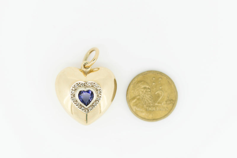 9ct Yellow Gold Hollow Heart Pendant with Heart Shaped Blue Sapphire with Accent Diamonds and Chain #234927