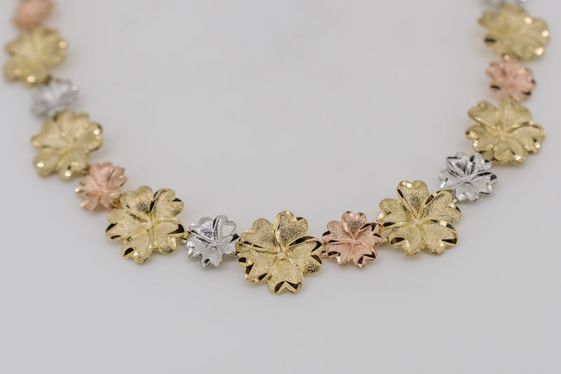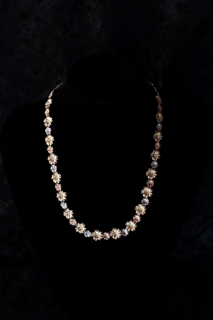 This beautiful work of art is made up of yellow, white and rose gold. The labour intensive floral necklace has been quality made and comes with floral earrings of a different make, but the two together work well.