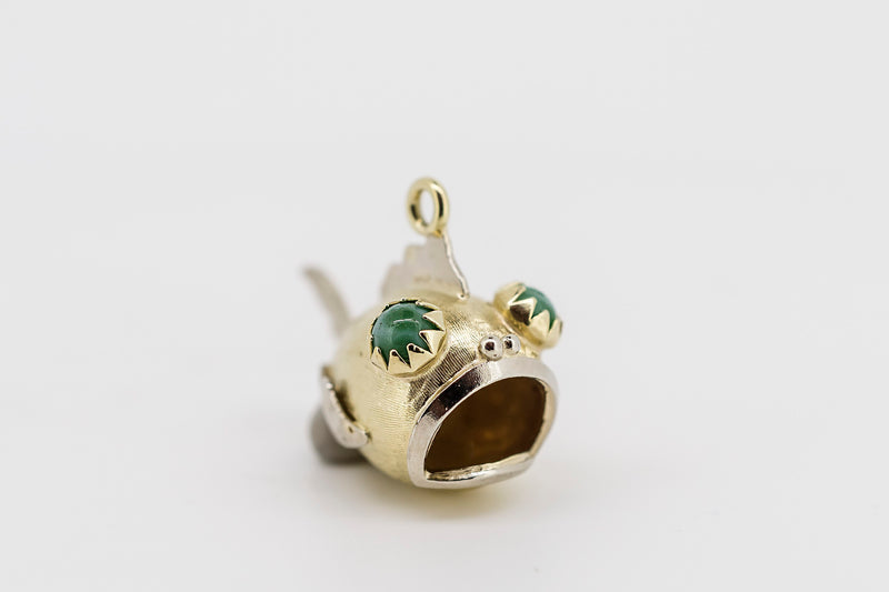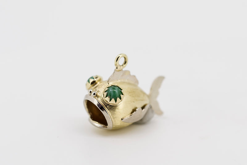 1960s Vintage blow fish in 14ct gold with green eyes. Beautifully detailed and has a brushed gold finish.