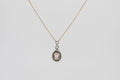 One 14 carat rose gold (stamped) cast production ladies double ‘halo-style’ pendant, from the Kallati Heirloom Collection, with one oval faceted morganite set in a four-claw setting. Thirty six champaign-type coloured round brilliant-cut diamonds are shared claw-set around the morganite. Thirty six white round brilliant-cut diamonds are shared claw-set on the outer halo with a further twenty eight round brilliant-cut diamonds set on - the loop, link and free-moving bale. Polished finish with oxidised plating around champaign-type diamonds. Weight: 1.85 grams