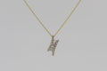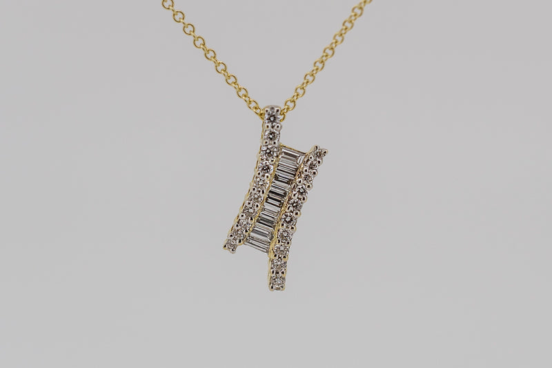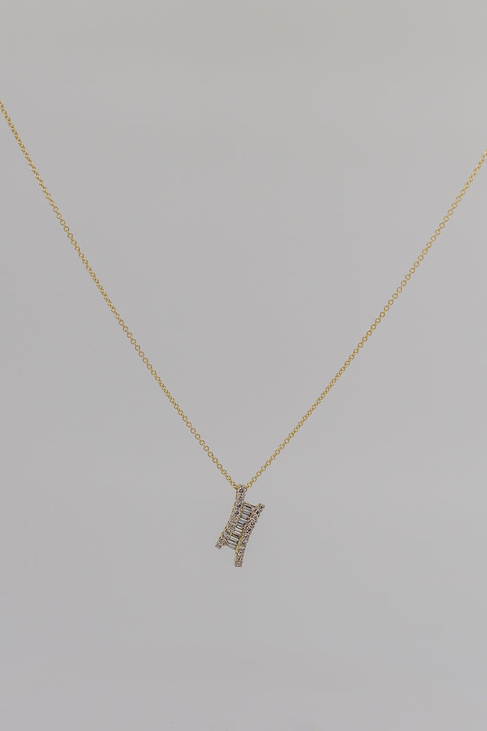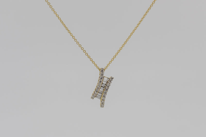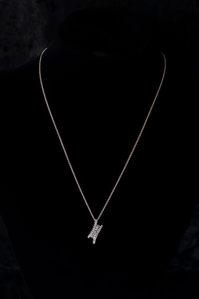 The pendent has 9 nine baguette diamonds through the middle surrounded by ten smaller diamond either side and is all encased in beautiful 18ct yellow gold.