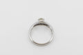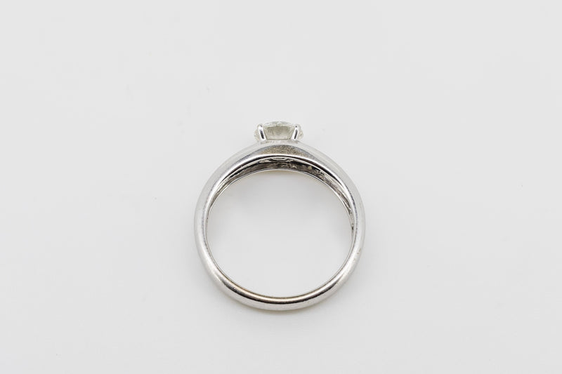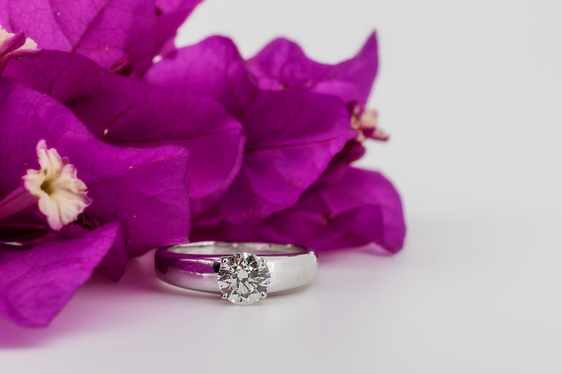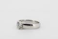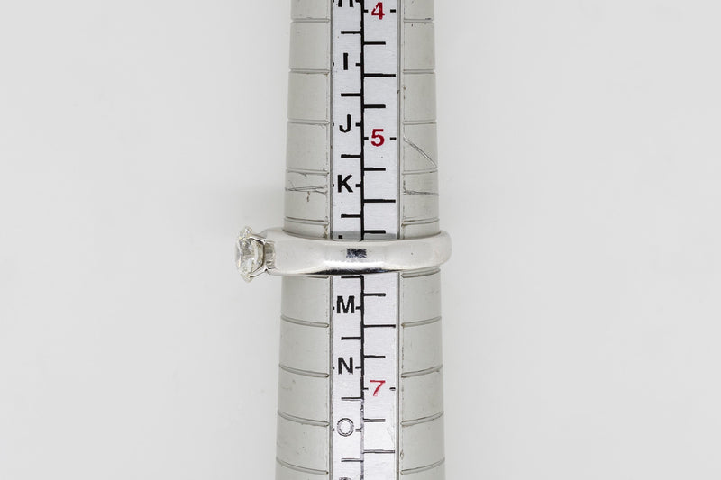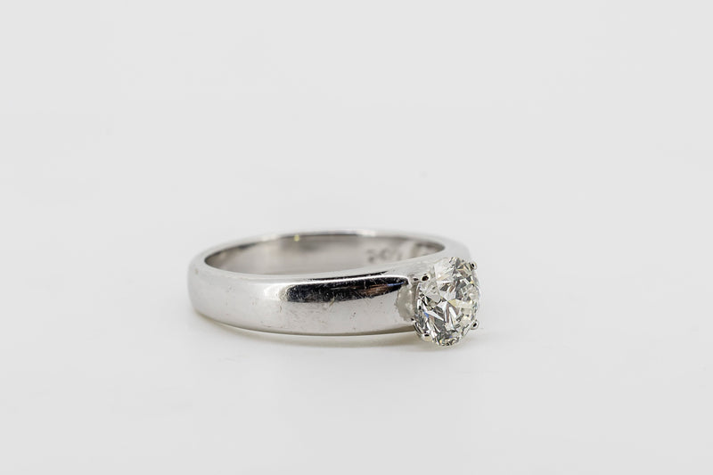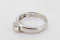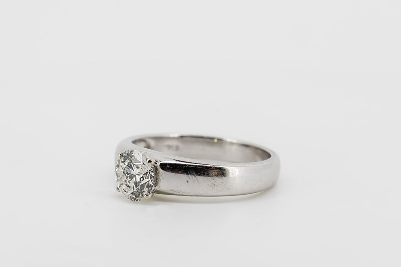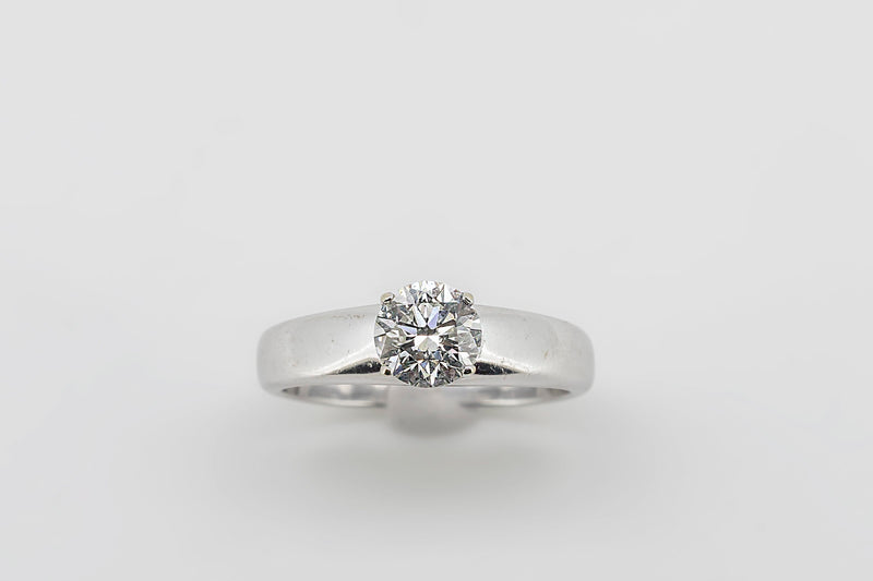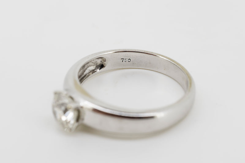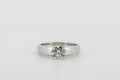 One 18 carat white gold (stamped) cast production ladies ring with one round brilliant-cut diamond set in a four-claw setting. Shank: tapered, slightly rounded profile; shoulders becoming raised. Rhodium plate finish. Weight: 3.78 grams; thickness of shank at base 1.2mm, width at base 3.0mm to 4.8mm at diamond.