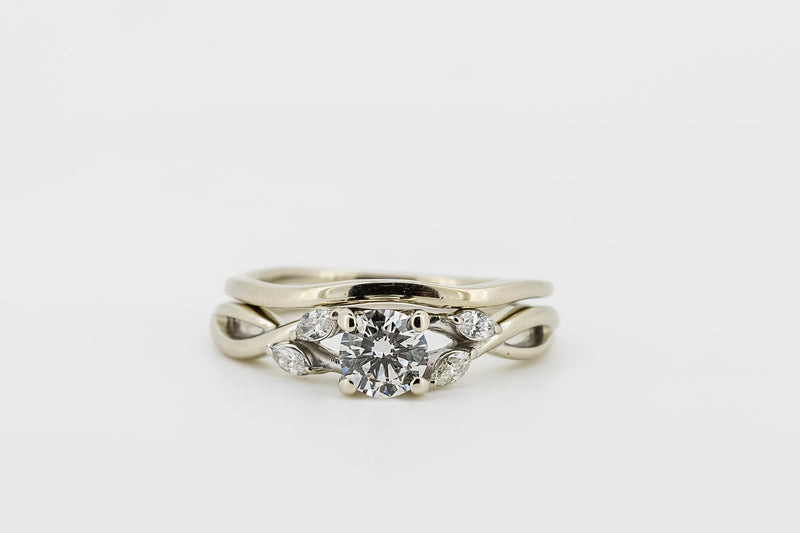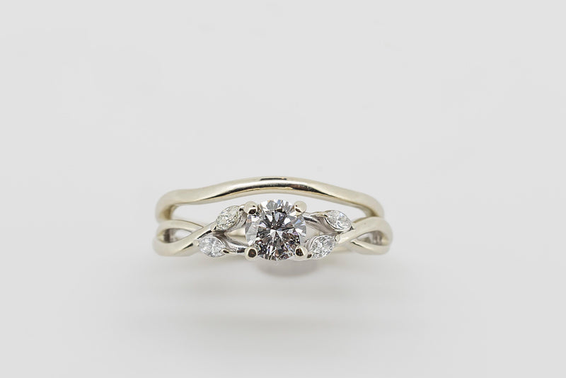 18ct white gold diamond ring. Featuring centre round brilliant cut Laboratory Grown* diamond, 4 claw set, approximately 0.50ct in weight (5.0mm), VS in clarity and F/G in colour. “Gemesis created LG10063506” is laser inscribed on girdle of stone. 4 marquise cut Laboratory Grown* diamonds, approximately 0.20ct in total combined weight, VS in clarity and F/G in colour. Ring is 2.79 grams in weight