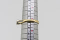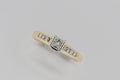 One 18 carat yellow gold (stamped) ladies ring, with one princess-cut diamond end-set in the raised centre setting. Eight princess-cut diamonds are channel-set on the shoulders. Shank: tapered, squared profile; shoulders becoming raised. Polished finish.