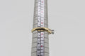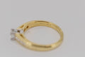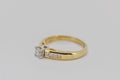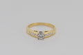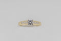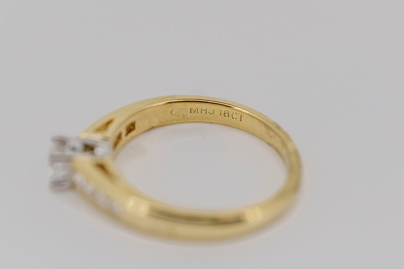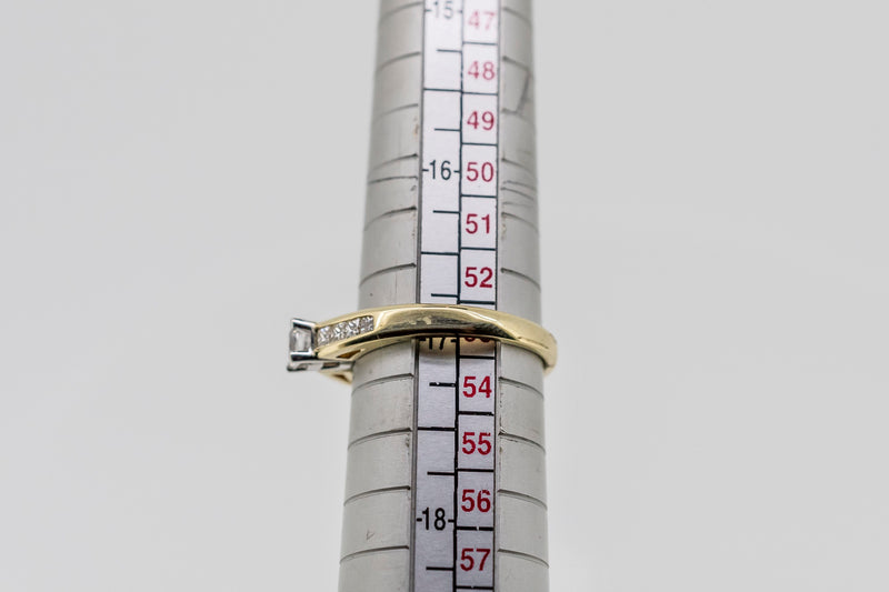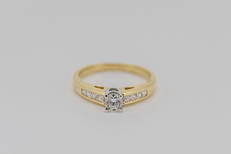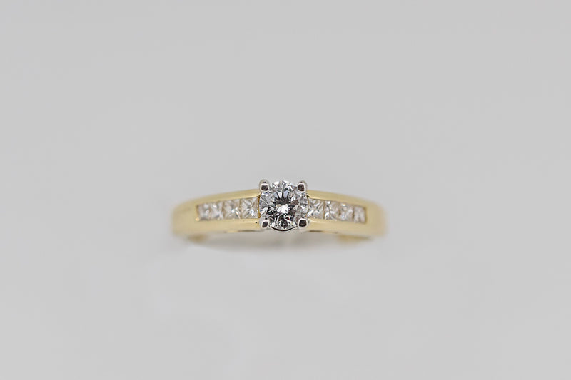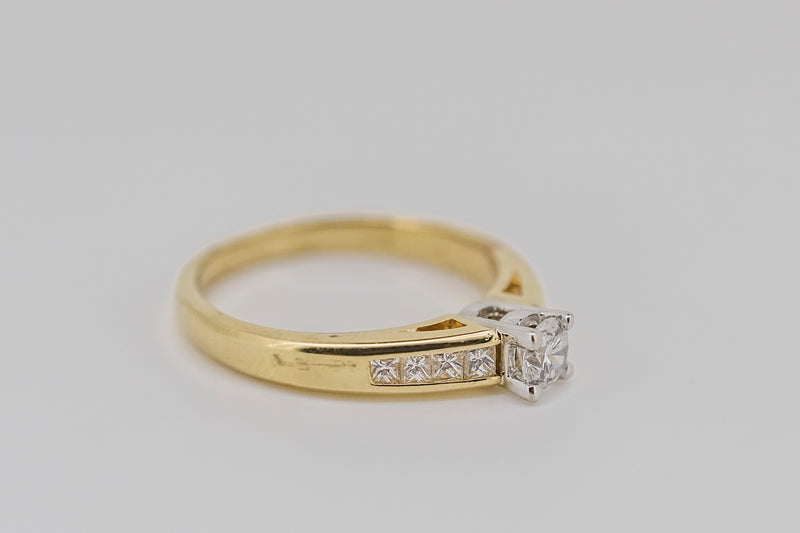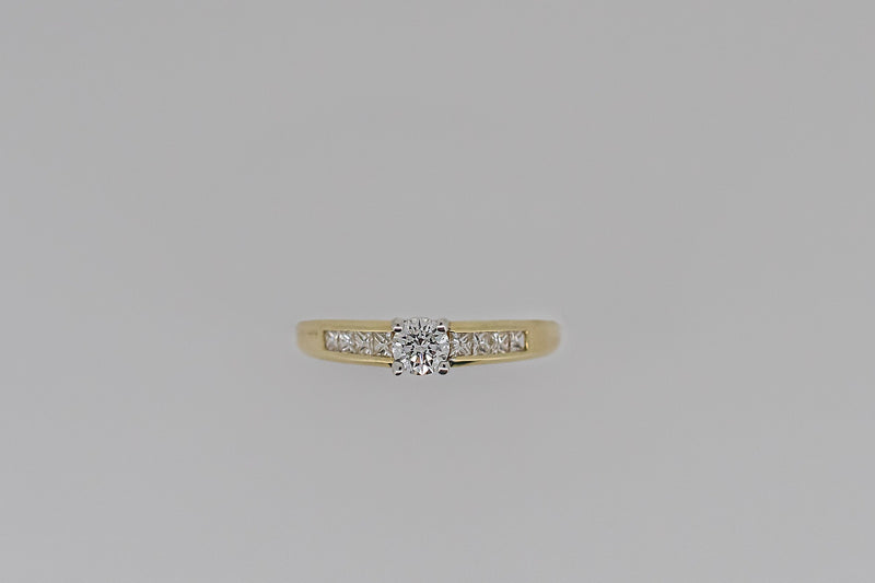 One 18 carat yellow gold (stamped) ladies ring, with one round brilliant-cut diamond set in a four-claw basket setting. Eight princess-cut diamonds are channel-set on the shoulders. Shank: tapered, slightly rounded profile becoming squared at shoulders; upswept shoulders. Polished finish with rhodium plate finish on centre setting. Weight: 4.05 grams; thickness of shank at base 1.3mm, width at base 2.3mm to 3.4mm at shoulder diamonds.