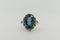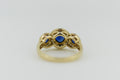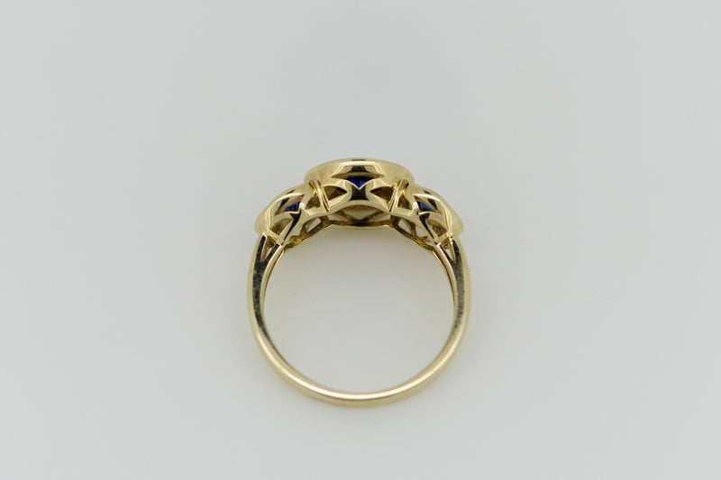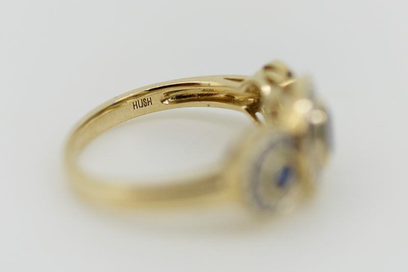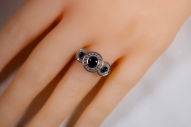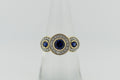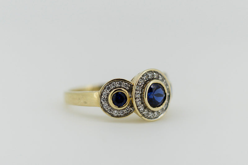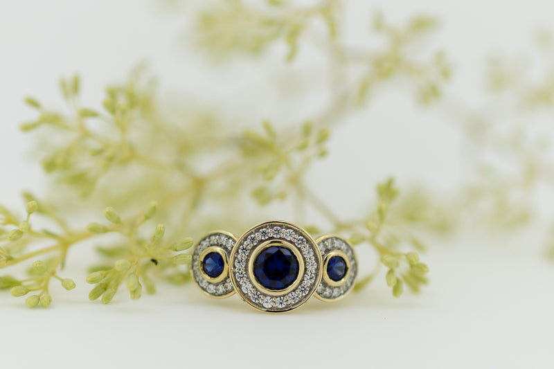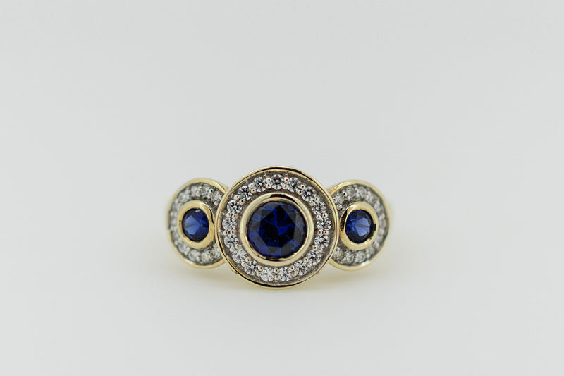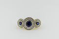 9ct Yellow Gold Blue Sapphire and Diamond Halo Trilogy Ring
