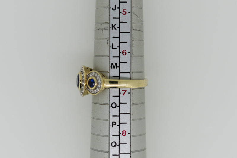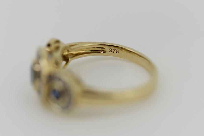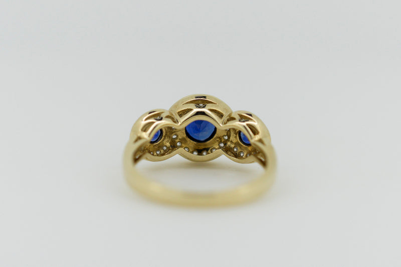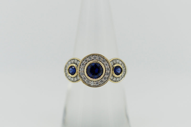 9ct Yellow Gold Blue Sapphire and Diamond Halo Trilogy Ring #9367