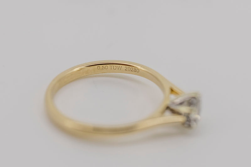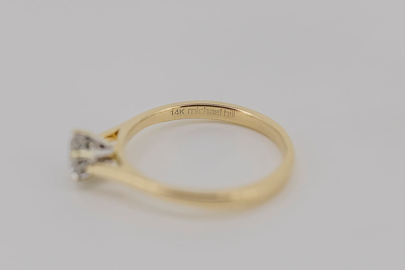 One 14 carat white gold (stamped) cast production ladies ring, of foreign make, with one round brilliant-cut diamond set in a six-claw white gold cast setting. Shank: tapered, squared profile; upswept shoulders. Inside shank: laser inscribed ‘14K’ ‘michael hill’ ‘0.50 TDW 20280'. Rhodium plate finish.