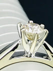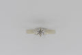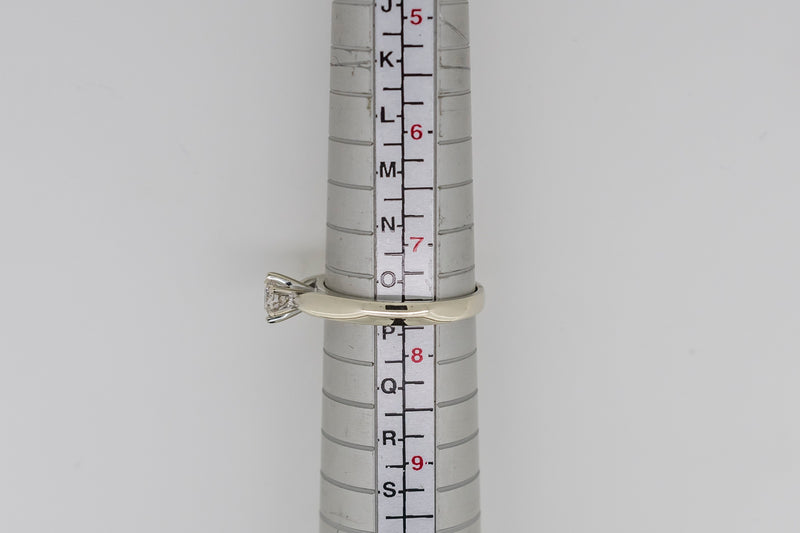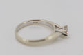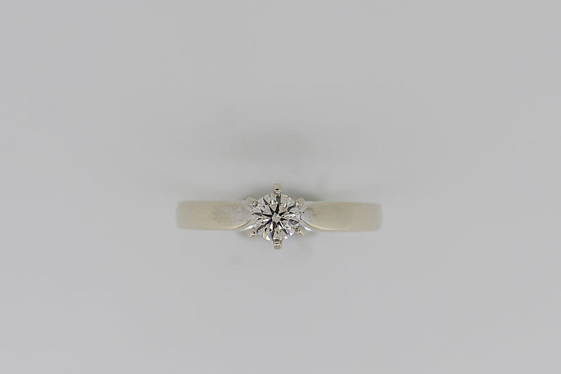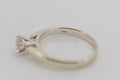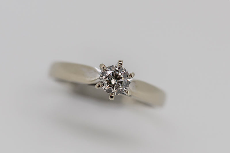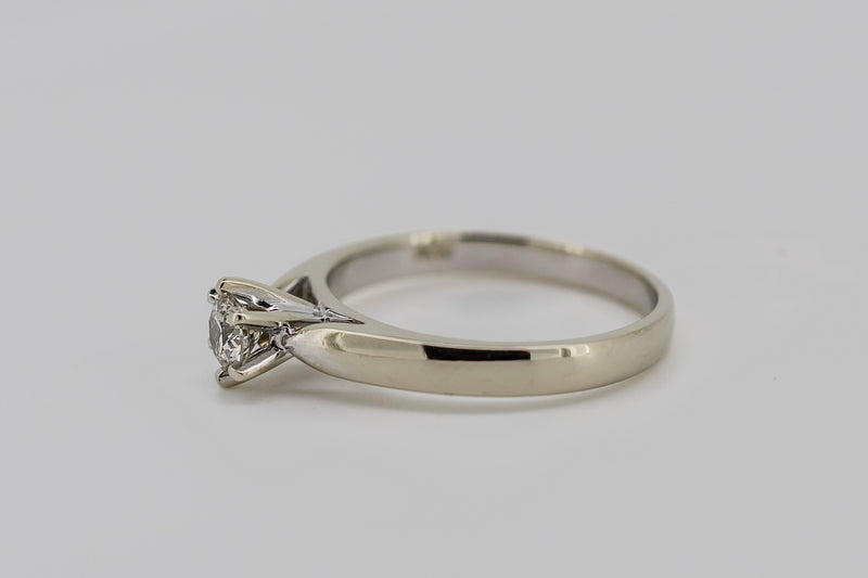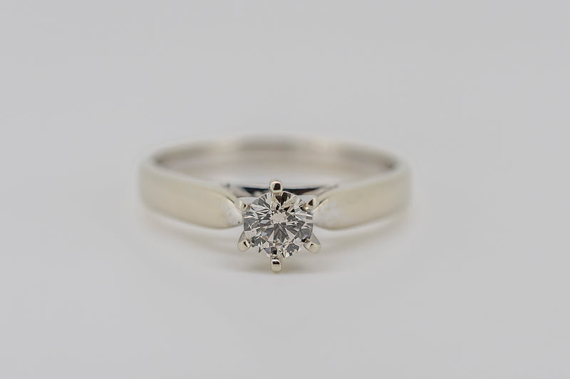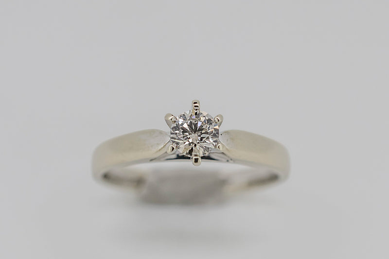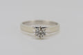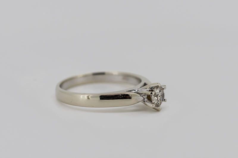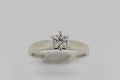 This ring has one round brilliant cut diamond set in a six claw setting. The shank is tapered with a slightly rounded profile. It has up swept shoulders tapering to points at the side of the setting with a rhodium plate finish.