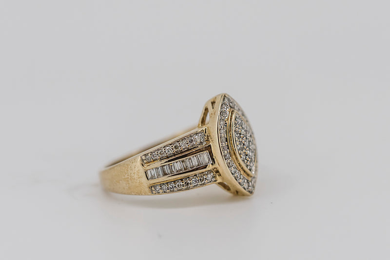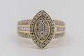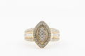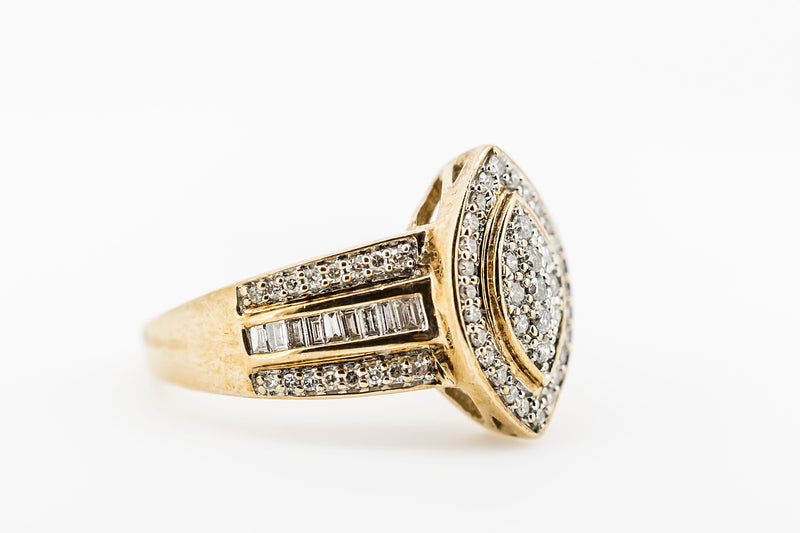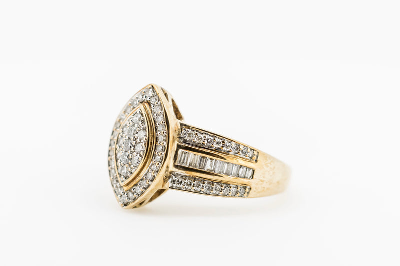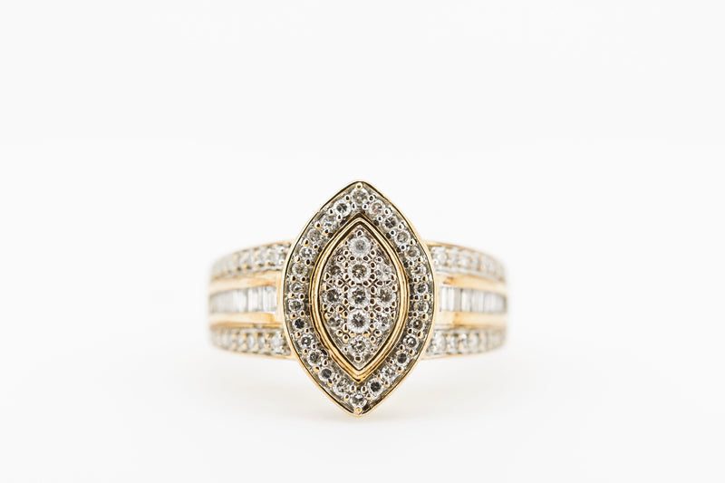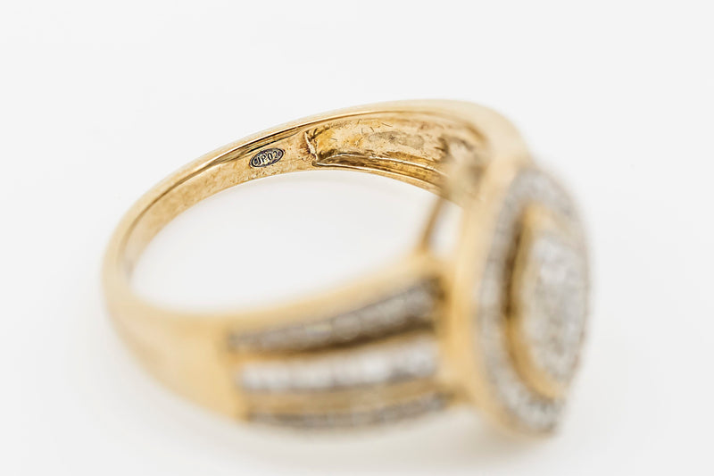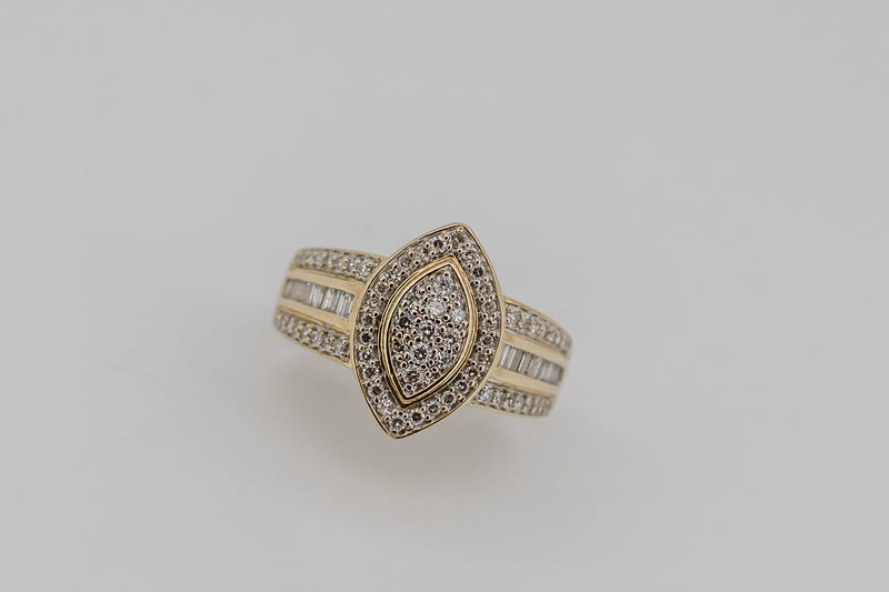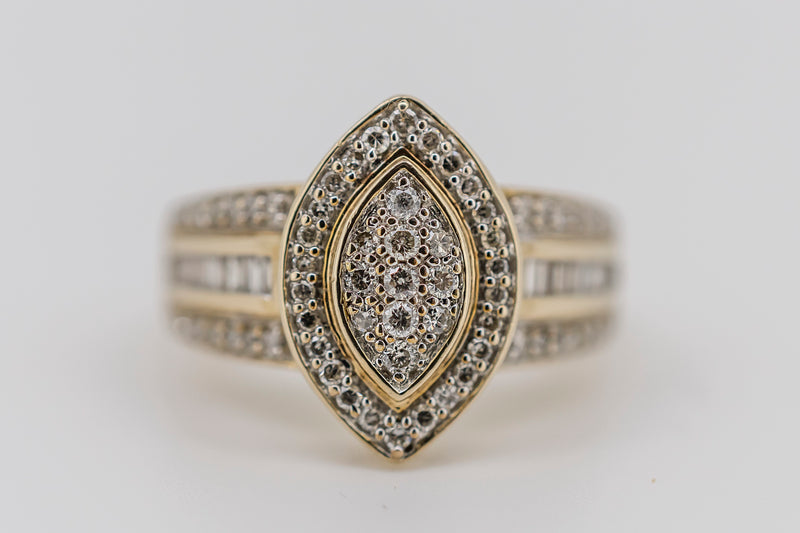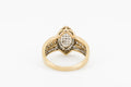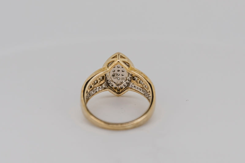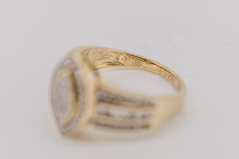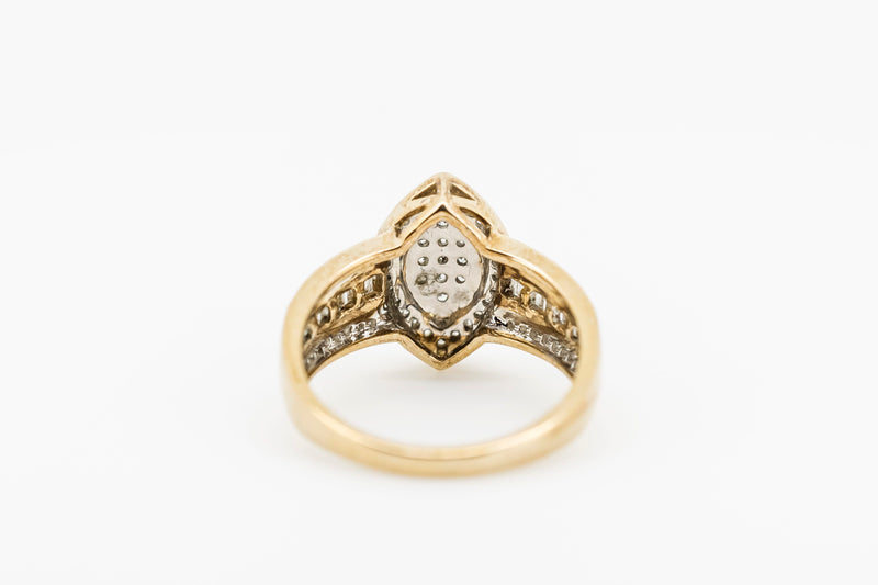 One 9 carat yellow gold (stamped) cast production ‘halo-style’ ladies ring, of foreign make, with seven round brilliant-cut diamonds and four round single-cut diamonds pave-set in the raised centre ‘marquise-shaped’ plate.