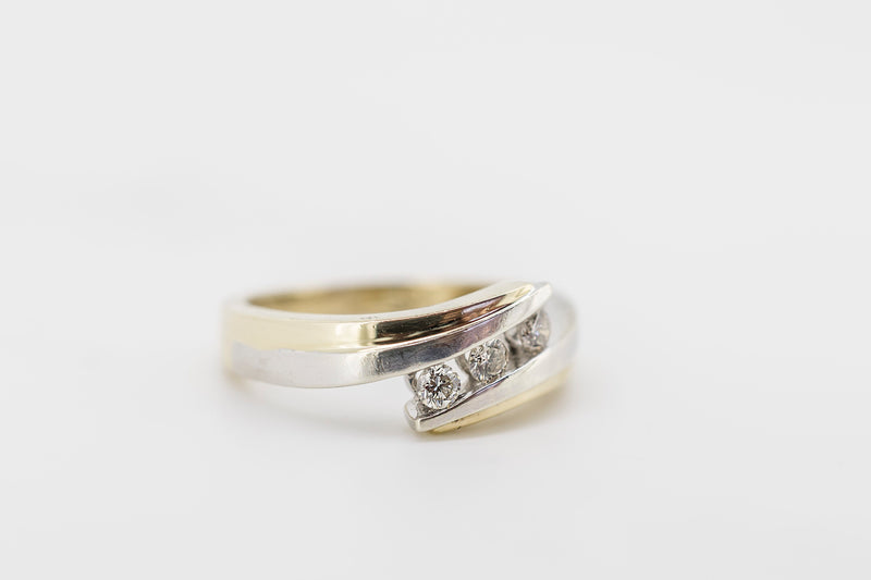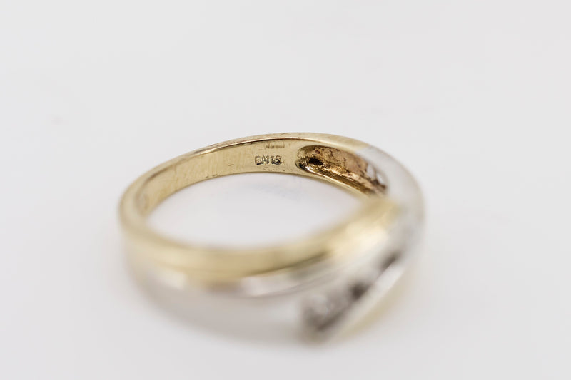 9CT Yellow and White Gold Ring with three diamonds. Yellow gold blending into white gold on the upper tops surrounding the three diamonds.