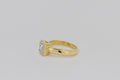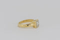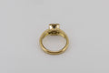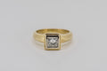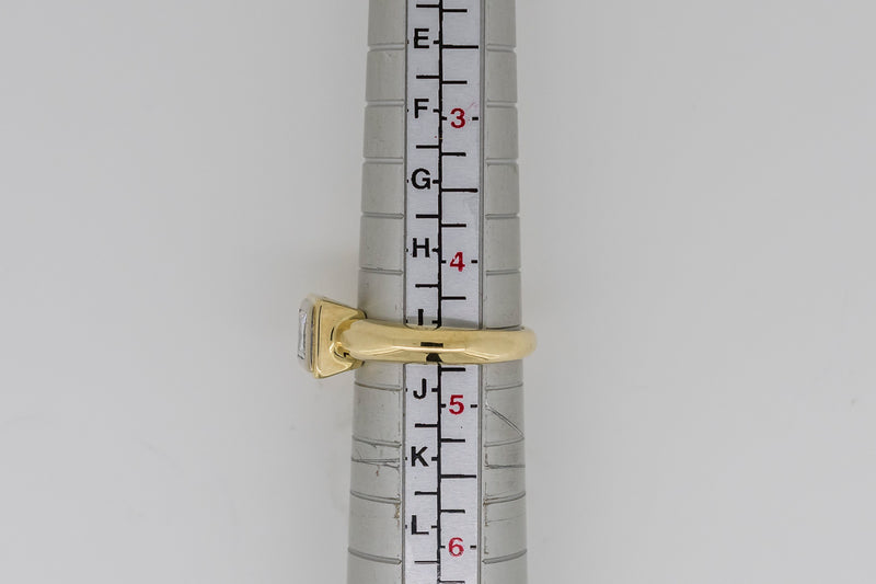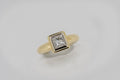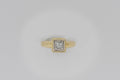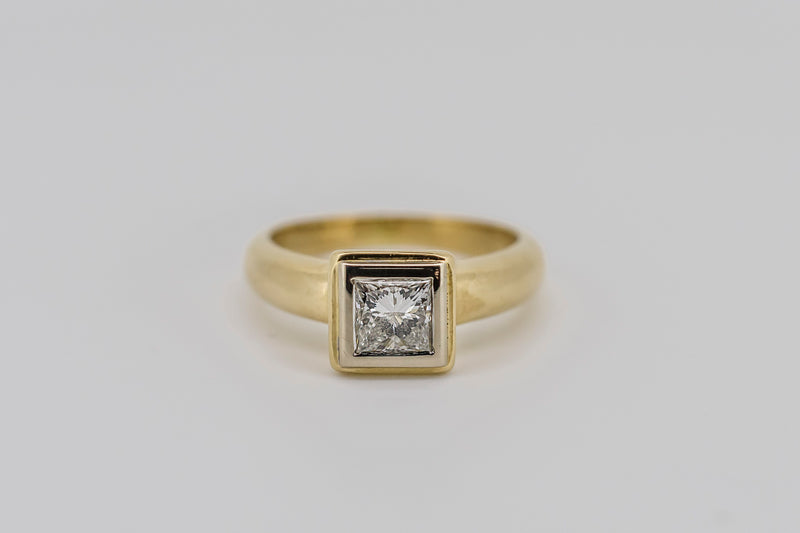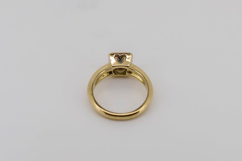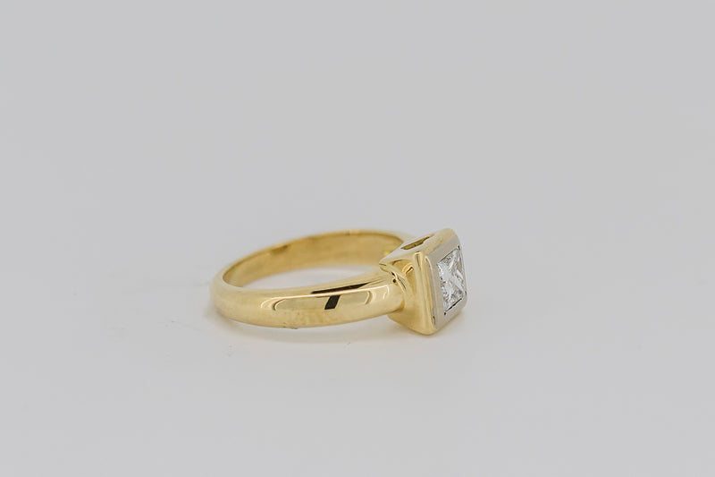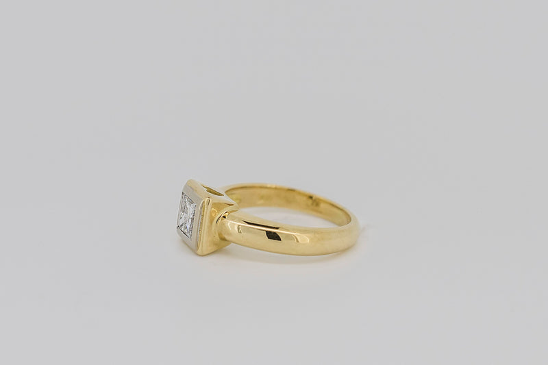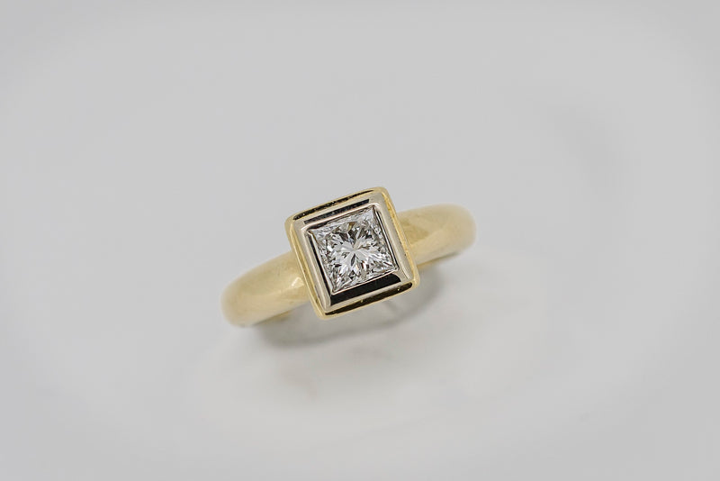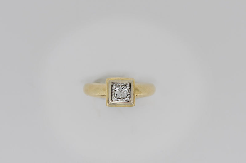 This princess cut diamond is bezel-set in a hand cut solid white gold plate. The white gold plate sits appon an 18ct yellow gold setting with a pierced heart on two sides.