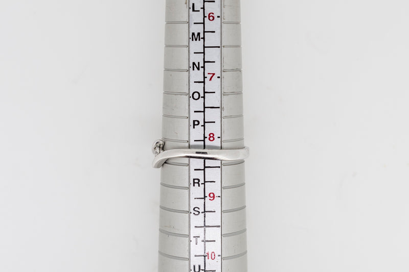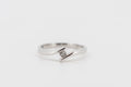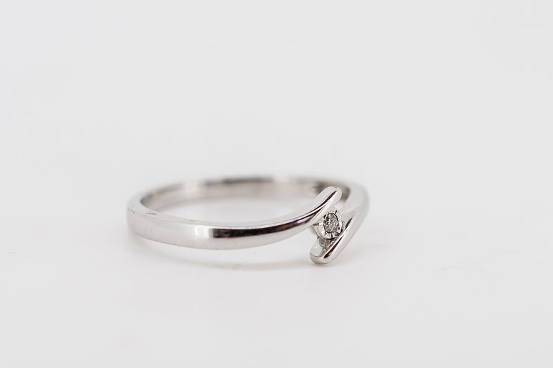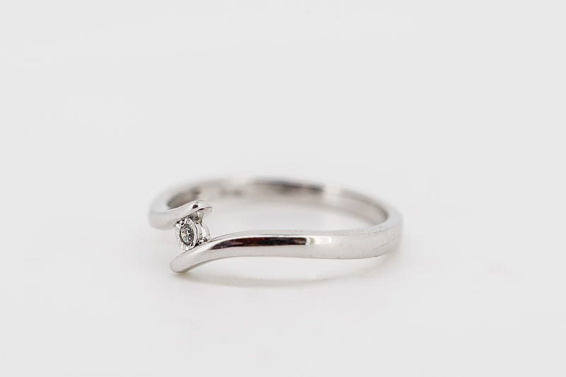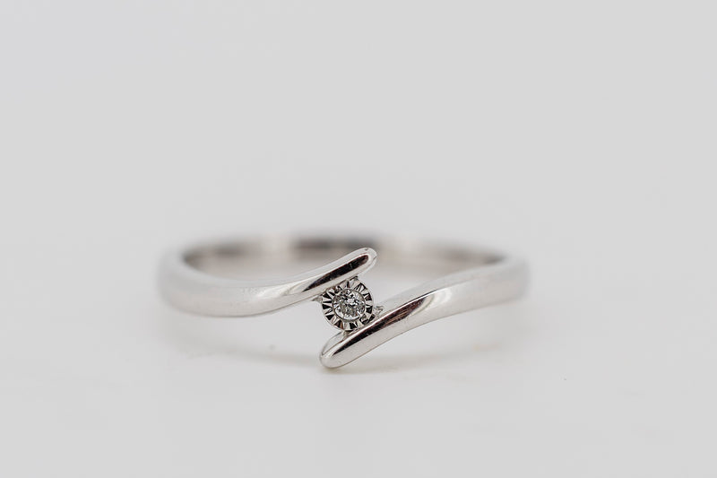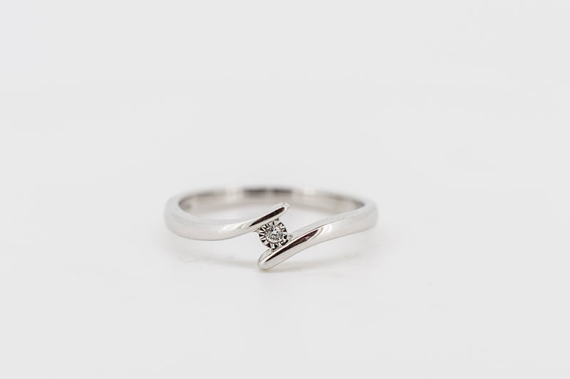 One 10 carat white gold (stamped) hand assembled, cast production ladies ring with one round brilliant-cut diamond grain-set into a round bevelled edged setting. The setting is soldered within the curved off-set shank. Shank: tapered, squared profile; shoulders becoming raised. Rhodium plate finish.